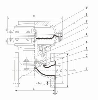 4. 閥體與蓋被中間隔膜隔開(kāi),使得隔膜上方的閥蓋,閥桿等零件不受介質(zhì)侵蝕;