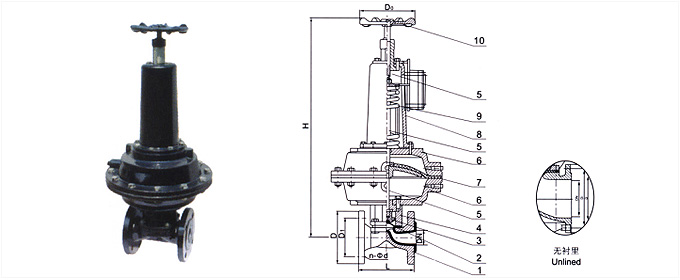 4. 閥體與蓋被中間隔膜隔開,使得隔膜上方的閥蓋,閥桿等零件不受介質(zhì)侵蝕;