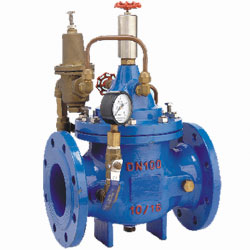 400X流量控制閥由主閥、流量調(diào)節(jié)閥、針閥、導(dǎo)閥、球閥、微形過濾器和壓力表組成水力控制接管系統(tǒng)。利用水力自動(dòng)操作,控制和調(diào)節(jié)主閥開度,使通過主閥的流量保持不變。