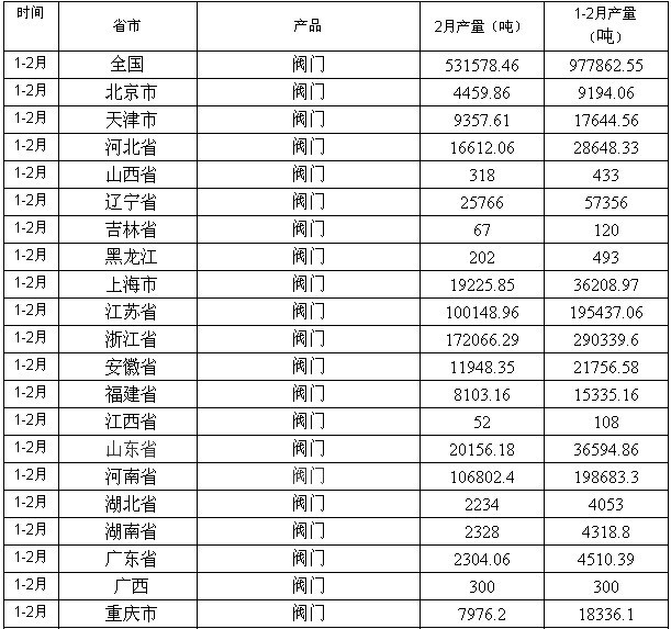 中國閥門市場前景頗好,據(jù)數(shù)據(jù)調(diào)查,1到2月份期間,全國的閥門總產(chǎn)量就達(dá)到977862.55噸之多。